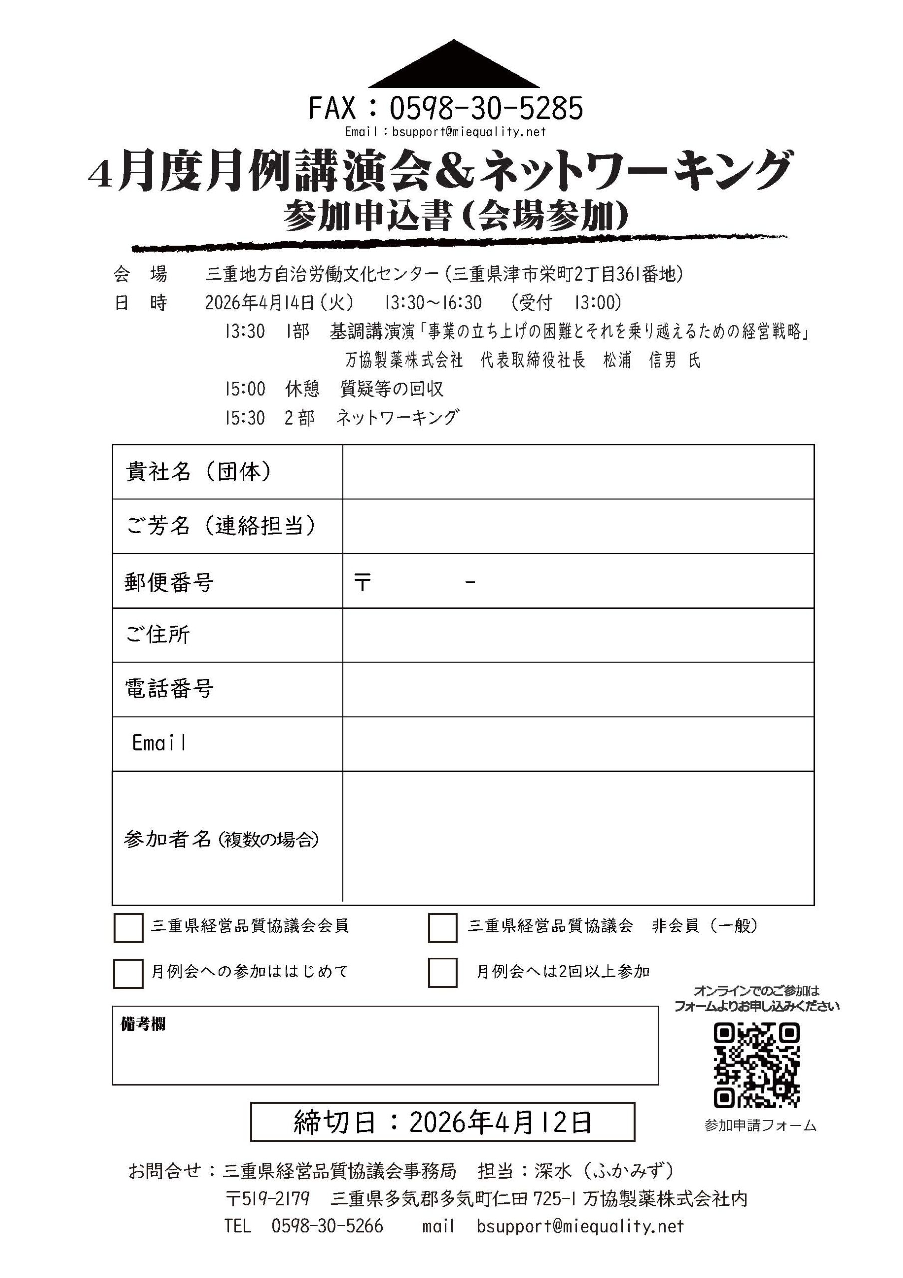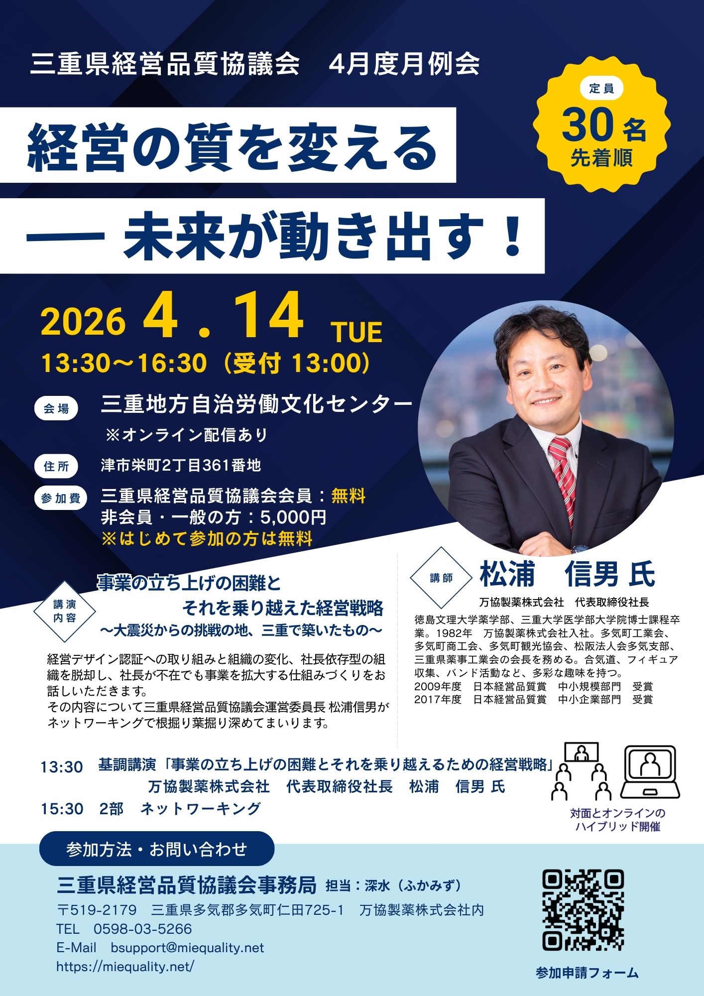 2025年4月より、三重県経営品質協議会の運営委員長と事務局を引き継ぎ、三重県の中小企業による経営品質活動の活性化はかってきた万協製薬株式会社 代表取締役社長 松浦信男氏に2026年度の初回月例会の講師をつとめていただきます。