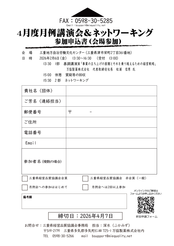 ◆参加費:三重県経営品質協議会会員 無料