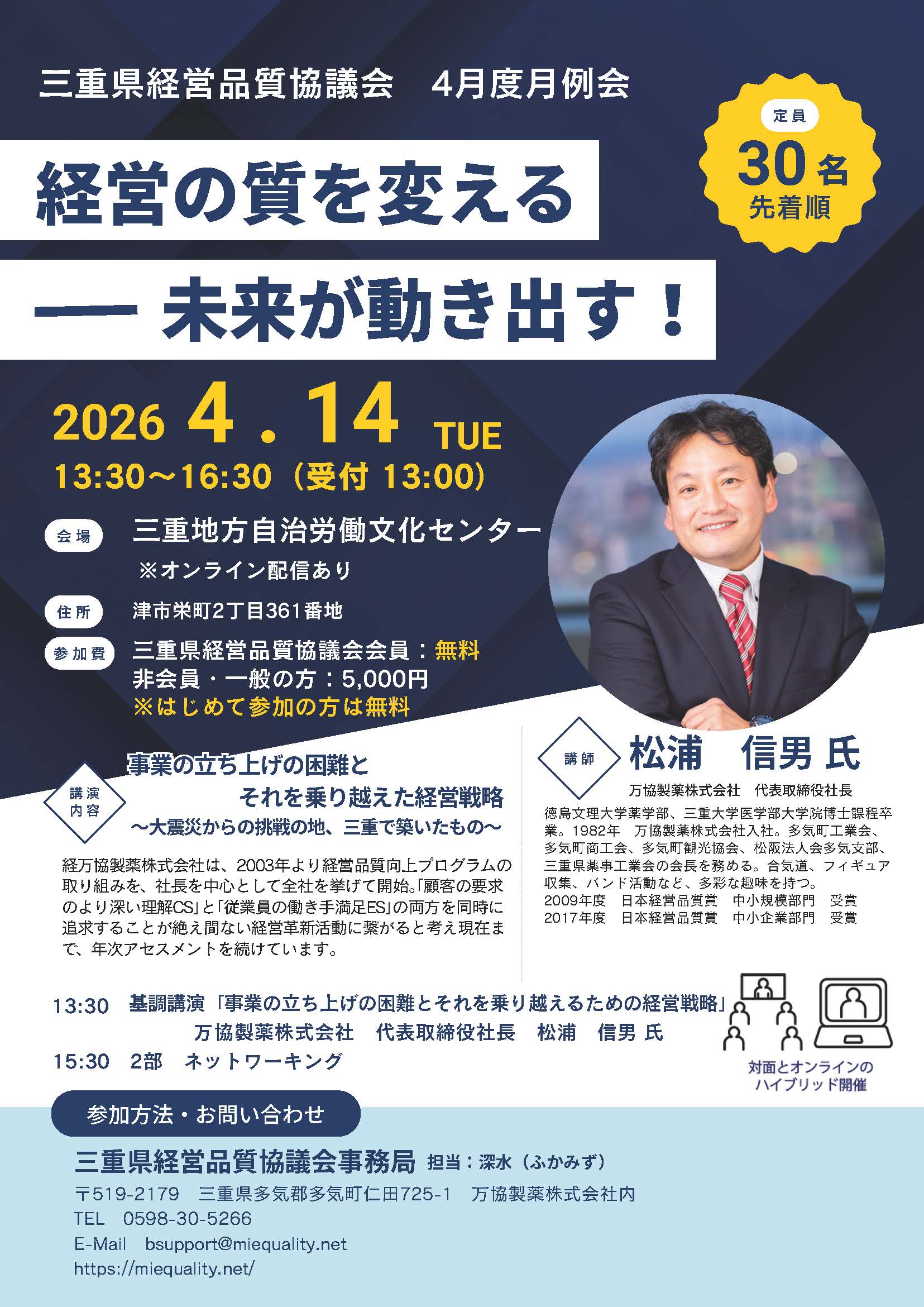 2025年4月より、三重県経営品質協議会の運営委員長と事務局を引き継ぎ、三重県の中小企業による経営品質活動の活性化はかってきた万協製薬株式会社 代表取締役社長 松浦信男氏に2026年度の初回月例会の講師をつとめていただきます。